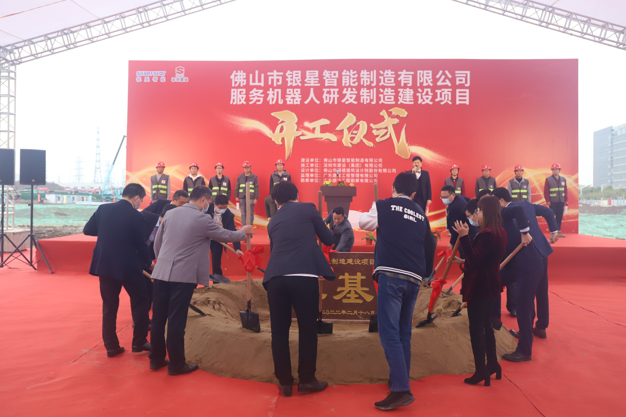 2022年2月18日,深圳建设集团承建的佛山银星智能制造有限公司服务机器人研发制造项目开工仪式隆重举行,深圳建设集团董事长兼总裁黄海带领高管团队为项目填土奠基;佛山市顺德区伦教街道人大工委主任王建,伦教街道办事处副主任李锦添;深圳银星智能集团股份有限公司副董事长张国栋,管委会联席主任、副总裁兼CFO何绍茂;设计单位和监理单位负责人一众领导出席仪式。